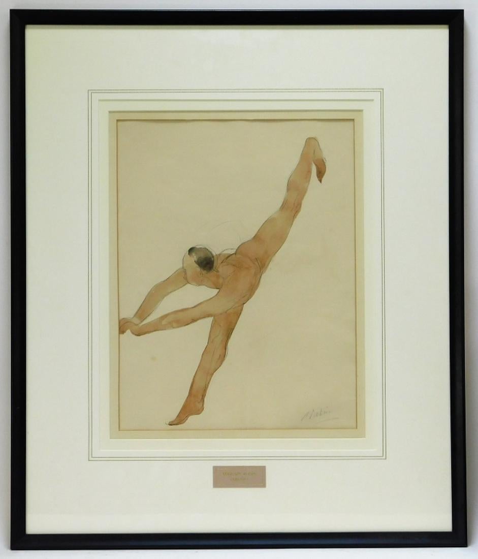 Watercolor nude study by Auguste Rodin (French, 1840-1917), of a woman standing on one foot and leaning forward with her other leg in the air, signed “A. Rodin” (est. $10,000-$15,000).