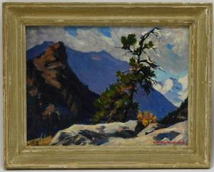 The plein air impressionist landscape painting by Rockport community artist Stanley Woodward (Mass., 1890-1970) is expected to command $1,500-$2,500. The signed and framed work depicts a rocky trail through the White Mountains of New Hampshire, along with a craggy tree in the foreground. A blue-purple monetesque color is used throughout the mountainous background.