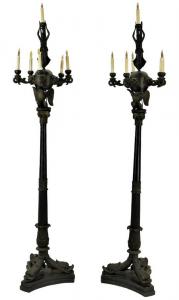 A strong candidate for top lot of the sale is the remarkable pair of 19th century French Empire neoclassical bronze torchieres, impressive at 84 inches tall each (est. $12,000-$18,000). The fine cast gilt and patinated bronze torchieres feature female winged goddesses surmounting a five-light sphere, with figural lion heads over opposing ormolu eagles, each on dolphin tripod bases.