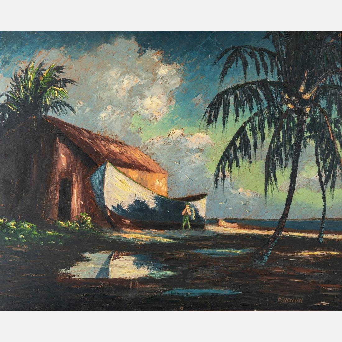 Oil on canvas board Harold Newton (1934-1994), a founding member of the Florida Highwaymen, a group of African American landscape painters, titled Beach Scene (est. $20,000-$40,000).