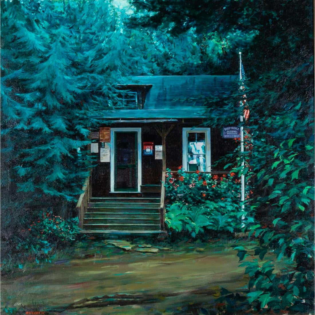 Oil on canvas by Frederick Widlicka (1907-1994), titled Adirondacks Post Office, Upper St. Regis Landing, signed and dated “77” lower left and nicely housed in a frame (est. $200-$400).