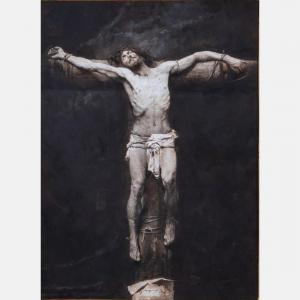 19th century ink and gouache on paper by Anton Widliczka, titled Crucifixion of Jesus, signed and dated (“1898”) lower center and presented in an 11 inch by 8 ¼ inch frame (est. $800-$1,200).