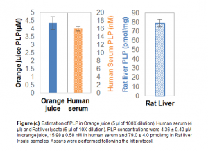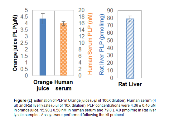 Figure: Estimation of PLP in Orange juice (5 µl of 100X dilution), Human serum (4 µl) and Rat liver lysate (5 µl of 10X dilution). PLP concentrations were 4.36 ± 0.40 µM in orange juice, 15.98 ± 0.58 nM in human serum and 79.0 ± 4.0 pmol/mg in Rat liver lysate samples. Assays were performed following the kit K2009 protocol.