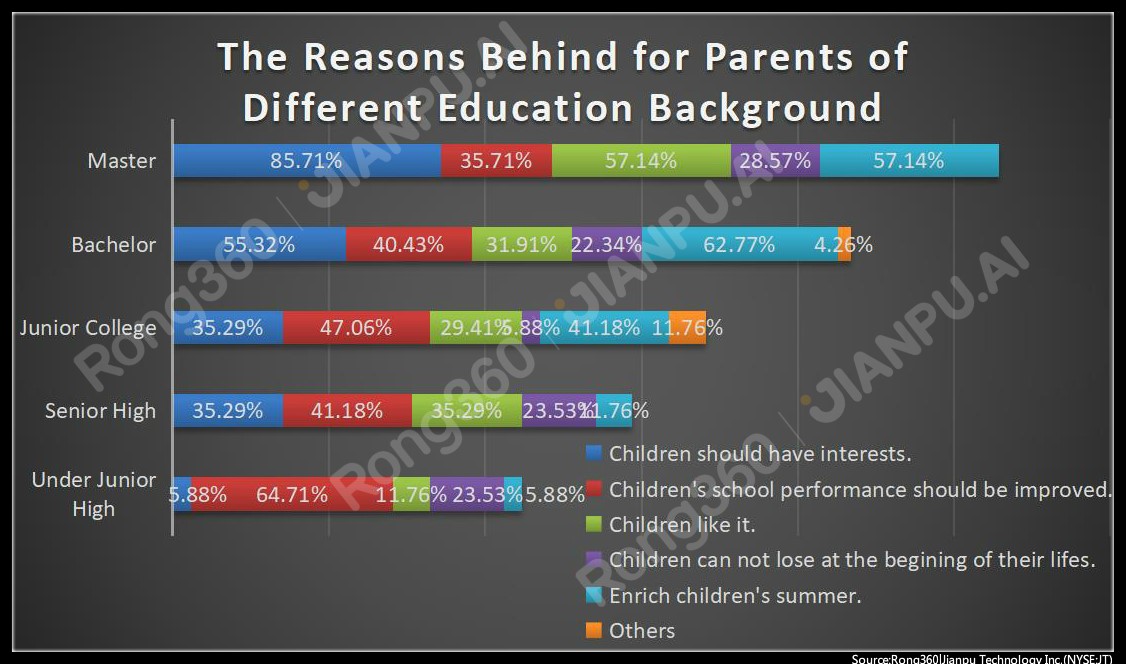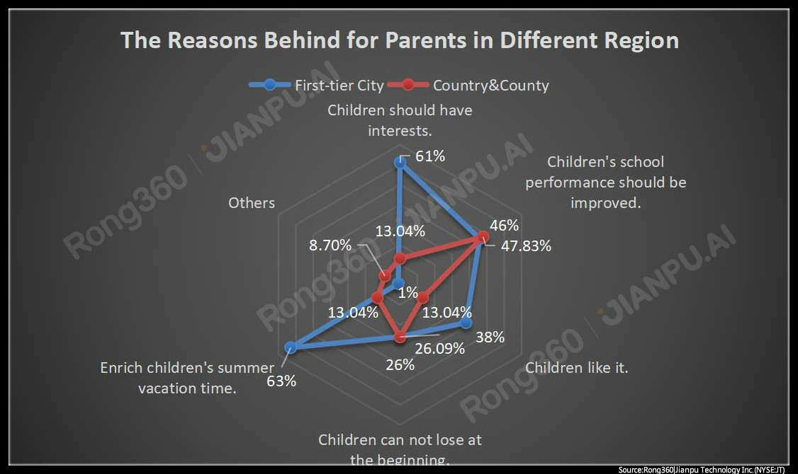 It is interesting that things are slightly different between first-tier cities and other locations. In first-tier cities, 61% of parents believe that "children should have interests and talents", according to the survey by Rong360 Jianpu Technology Inc. (NYSE:JT). 63% of parents think that "children have too much spare time in summer vacation, so they should take classes to make better uses of their time".