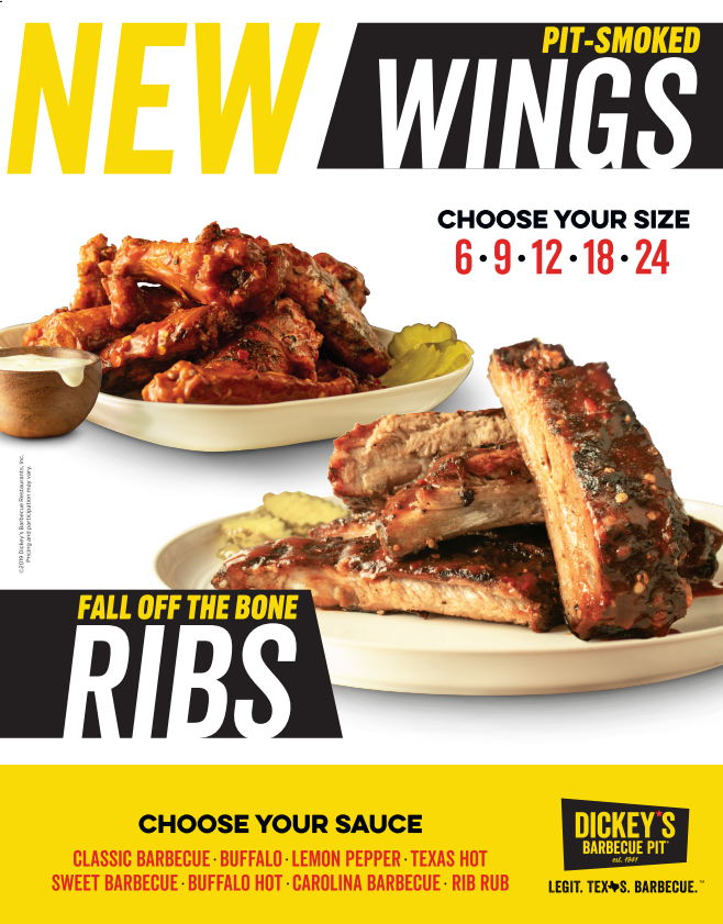 Dickey’s Texas-style wings and ribs are now available in 6, 9, 12, 18 and 24 pieces to feed every size good time gathering.
