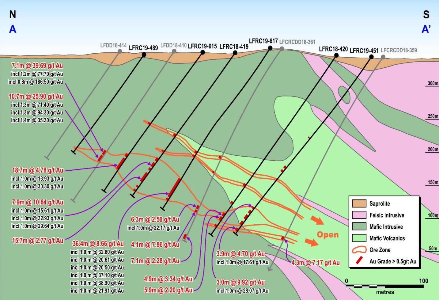- LFRC19-617: 36.4m at 8.66 g/t Au, including 1.00m at 32.60 g/t Au, , including 1.00m at 20.61 g/t Au, including 1.00m at 16.24 g/t Au, including 1.00m at 20.50 g/t Au, including 1.00m at 37.10 g/t Au, including 1.00m at 38.90 g/t Au, including 1.00m at 21.91 g/t Au