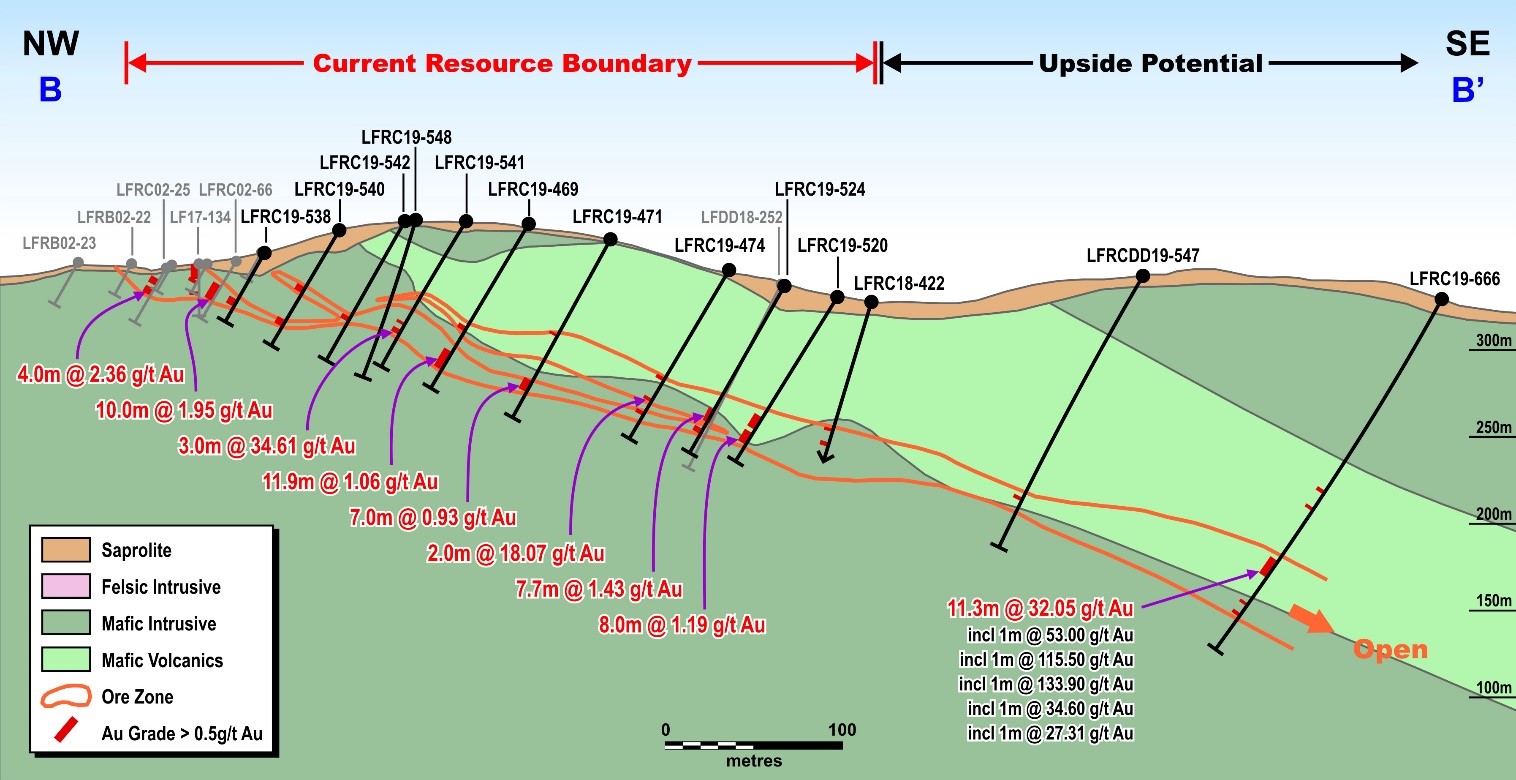 - LFRC19-493: 32.5m at 13.38 g/t Au, including 1.00m at 46.30 g/t Au, including 1.00m at 54.90 g/t Au, including 1.00m at 21.20 g/t Au, including 1.00m at 103.70 g/t Au, including 1.00m at 48.00 g/t Au, including 1.00m at 39.00 g/t Au, and including 1.00m at 21.23 g/t Au, and 12.8m at 2.80 g/t Au