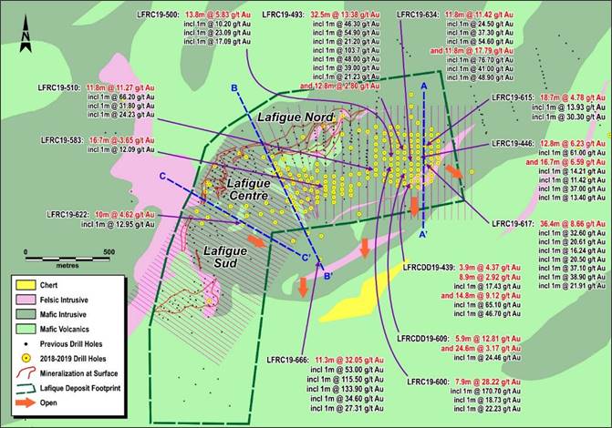 As shown in Figures 2 and 4 above, hole LFRC19-666 which was drilled 200 meters away from the current resource boundary and intercepted very high mineralization (11.3m at 32.05 g/t, including 1.0m at 53.00 g/t Au, 1.0m at 115.50 g/t Au, 1.0m at 10.27 g/t Au, 1.0m at 133.90 g/t Au, 1.0m at 34.60 g/t Au, 1.0m @ 27.31 g/t Au) suggests that the mineralized area could be significantly larger. Very high-grade mineralization that were intercepted with step out drilling follow the same general structural and lithological model as observed at Lafigué North and Center.
