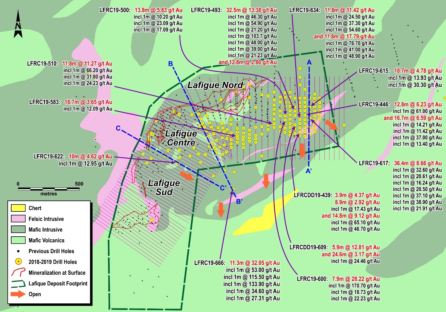 - LFRC19-500: 13.8m at 5.83 g/t Au, including 1.00m at 10.20 g/t Au, including 1.00m at 23.09 g/t Au, including 1.00m at 17.09 g/t Au