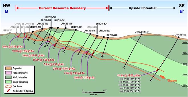 - LFRC19-666: 11.3m at 32.05 g/t Au, including 1.00m at 53.00 g/t Au, including 1.00m at 115.50 g/t Au, including 1.00m at 133.90 g/t Au, including 1.00m at 34.60 g/t Au, including 1.00m at 27.31 g/t Au