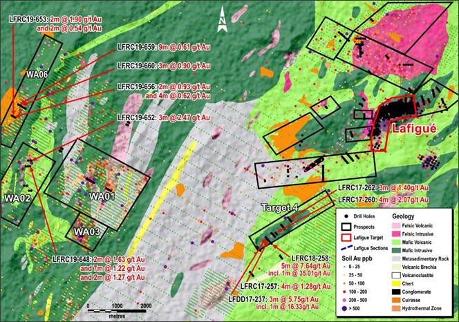 Figure 2: Lafigué Geological Interpretation and Selected Best Intercepts Per Area