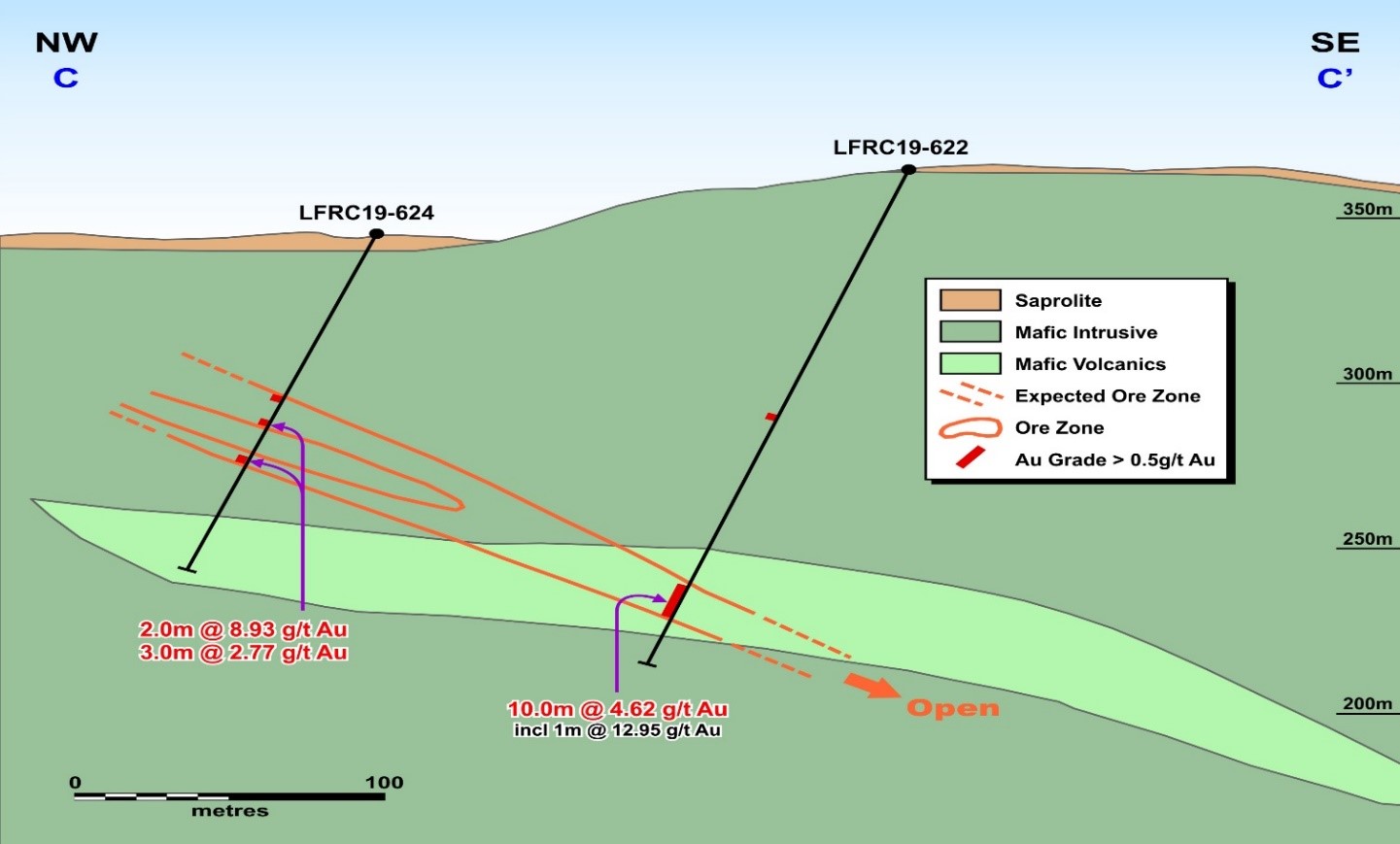 - LFRC19-497: 6.9m at 2.93 g/t Au, and 10.8m at 7.12 g/t Au, including 1.00m at 50.90 g/t Au, and 8.9m at 2.65 g/t Au.