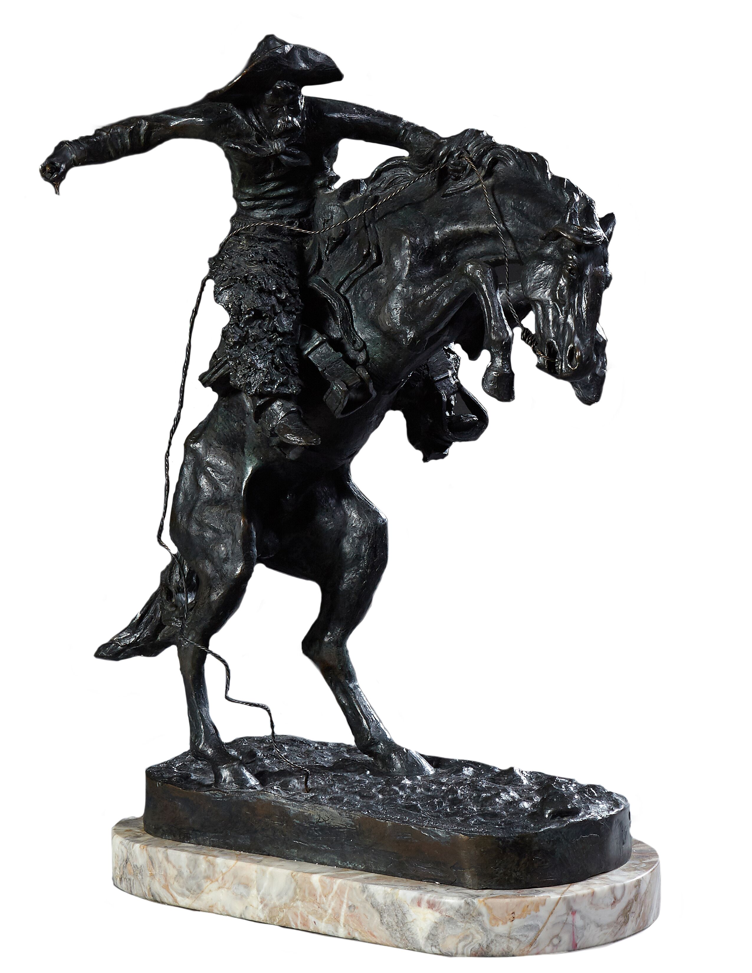 Circa 1900 patinated bronze by Frederic Remington (1861-1909), titled The Wooly Chaps, 22 ¾ inches tall, impressed “Roman Bronze Works N.Y.” (est. $1,500-$2,500).