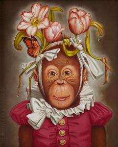 Oil on board painting by Donald Roller Wilson (Arkansas, b. 1938), titled Cookie (2005), a whimsical depiction of a chimpanzee dressed in a clown costume (est. $10,000-$15,000).