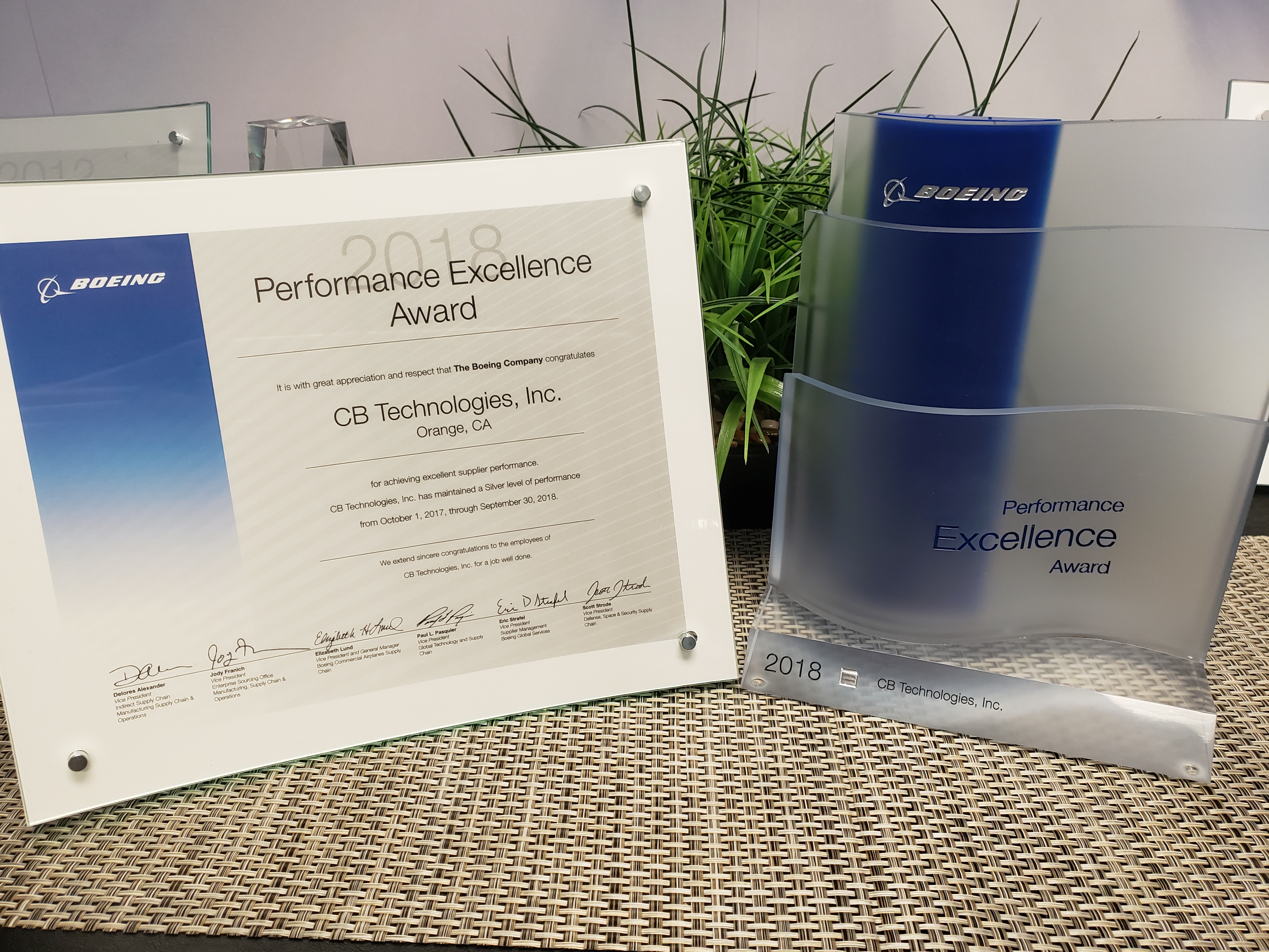 Orange, CA, Sept. 09, 2019 (GLOBE NEWSWIRE) -- CB Technologies, Inc. today announced that it has received a 2018 Boeing Performance Excellence Award. The Boeing Company issues the award annually to recognize suppliers who have achieved superior performance. CB Technologies maintained a Silver composite performance rating for each month of the 12-month performance period, from October 2017 to September 2018.