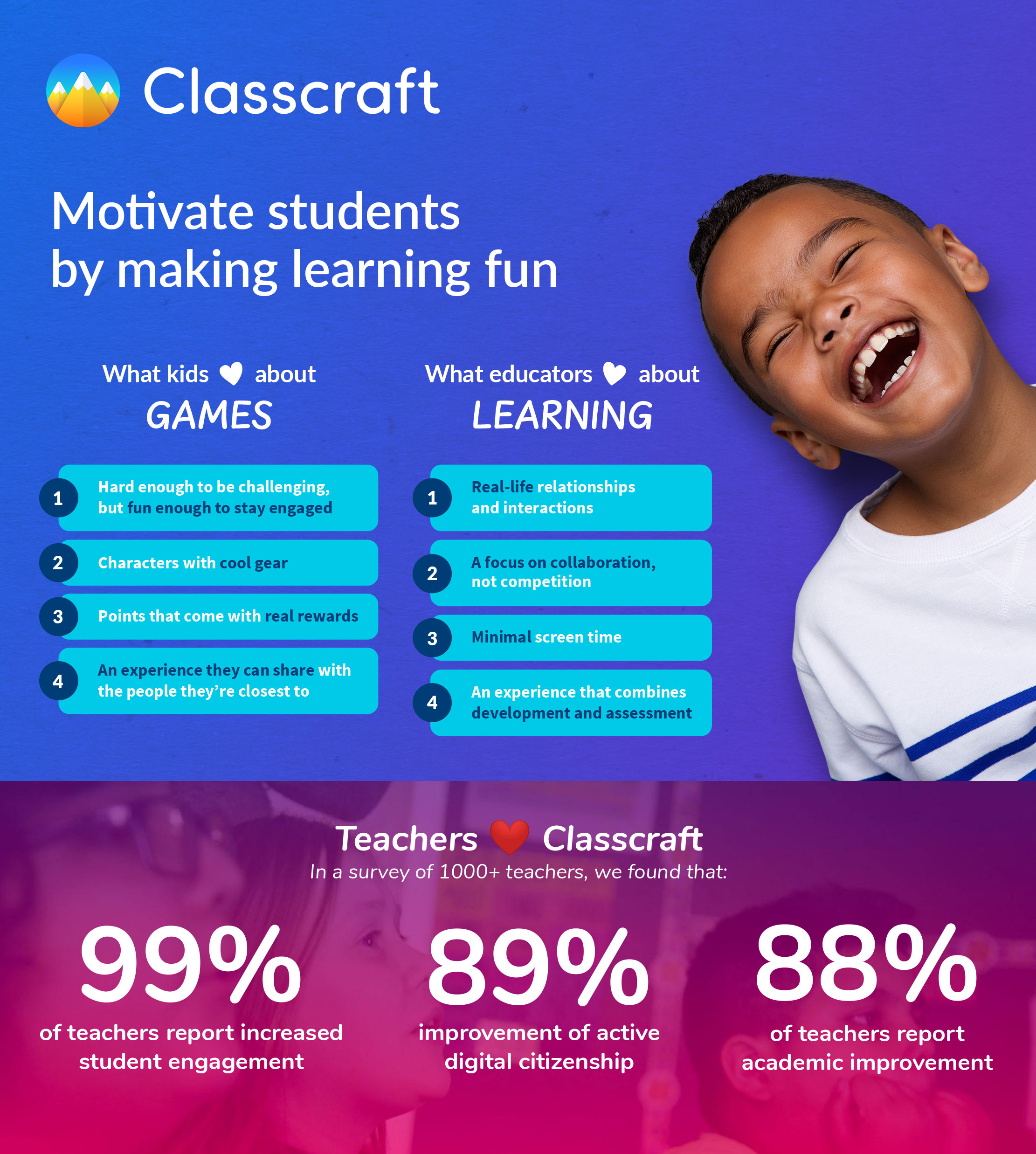 Classcraft helps educators motivate students by making learning fun. Classcraft combines time-tested pedagogy with a modern approach, harnessing the power of what kids love — games and stories — to promote connections between students and teachers that make learning more meaningful.