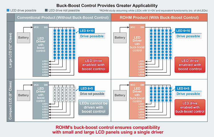 The BD81A76EFV-M incorporates proprietary buck-boost control to provide greater application flexibility in LCD applications. In contrast to conventional 6channels backlight LED drivers utilizing only boost control. Although conventional LED drivers are only capable of driving 36 to 60 LEDs (6-10 LEDs/channel), ROHM’s new driver IC expands the range from 6 to 60 LEDs (1-10 LEDs/channel). This ensures the support of not only larger displays but also small and medium size panels as well using a single driver, contributing to a common design of control board.