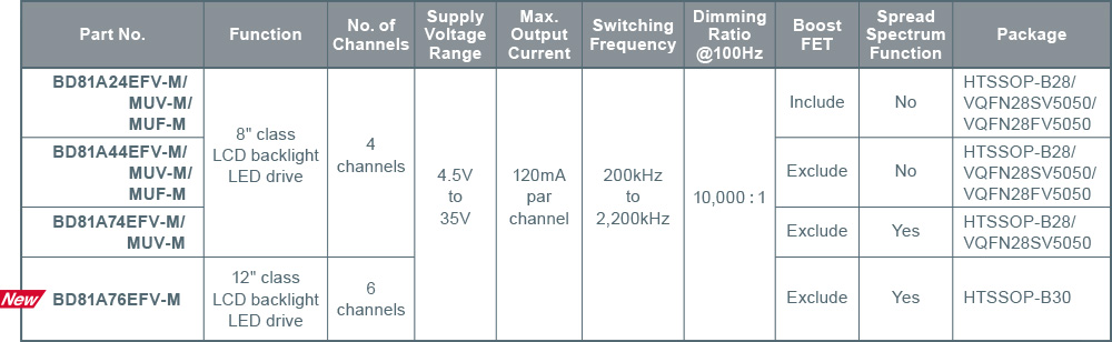 In recent years, to improve both visibility and design in the automotive field, LCDs are being used in an increasing number of systems including instrument clusters, head-up displays and car navigation. In addition, larger screen sizes are being demanded. They require a greater number of high brightness LEDs for backlight as well as LED drivers featuring multi-channel operation and advanced dimming features that can prevent flicker effects.