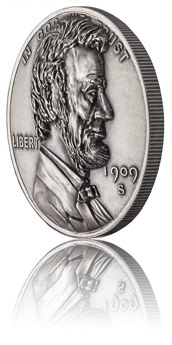 Just as the debut of the 1909-S Lincoln Penny was highly anticipated when it first appeared, so too is the introduction of this Osborne Mint 1909-S Lincoln Penny collectible. Stamped into one full once of .999 fine silver, the 1909-S Lincoln Penny collectible displays the portrait of Abraham Lincoln along with the 1909-S marking. These components are enhanced for detail with the obverse (front) of the round being convex with the etched imagery towering over the coin, nearly 10 times deeper and more detailed than the original. The silver blanks for this collectible are actually struck three times with domed, deep relief dies with a force greater than 160 tons. In this manner the imagery can be pressed into the round with a depth of .070” deep, compared to traditional reliefs of .012” deep. The detail of this art can be seen in every wisp of Lincoln’s beard and hair to every crease in his bow tie and suit coat. The coin is convex and engraved deep enough to actually hold water.