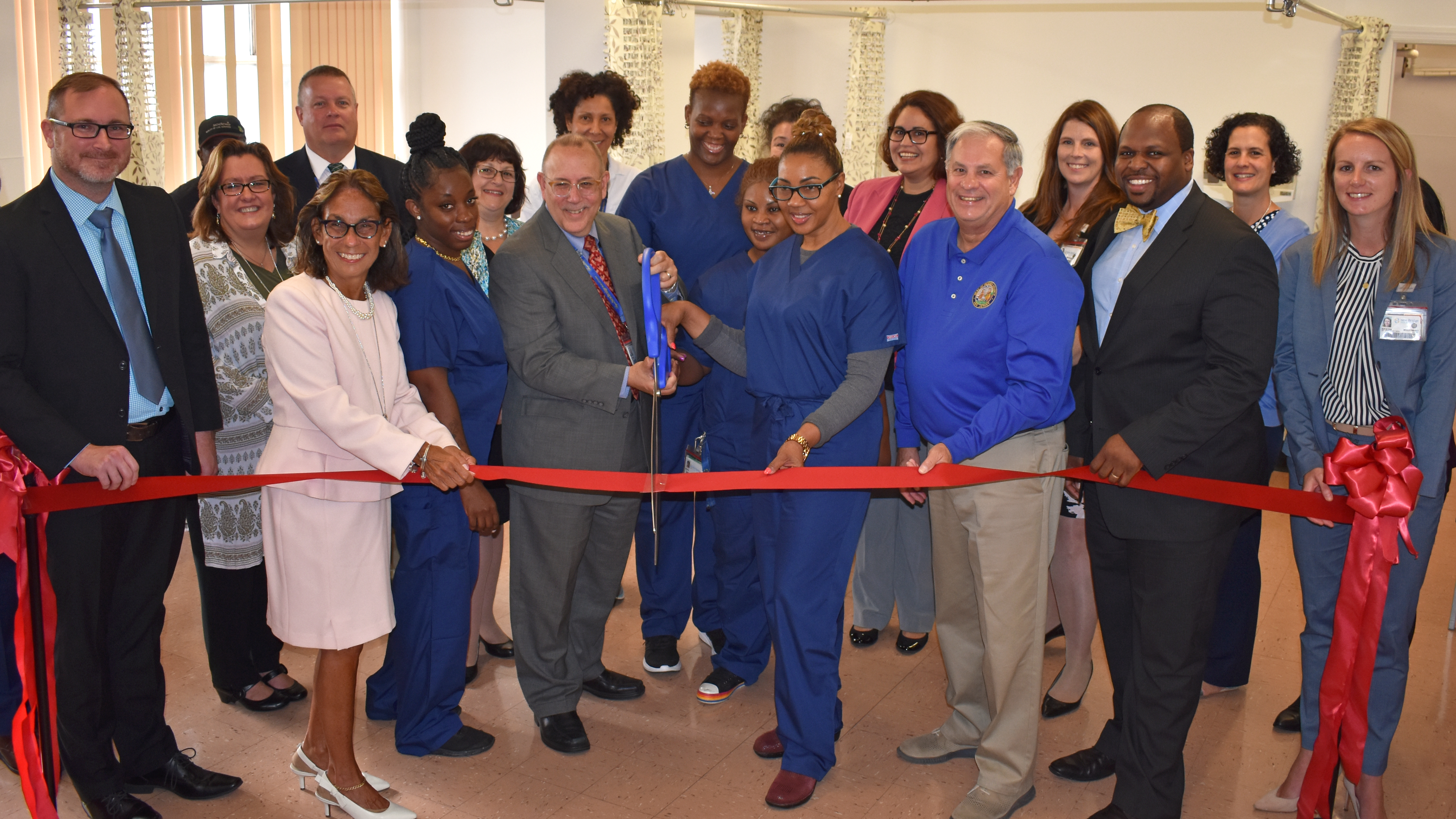 Ribbon cutting for the Bergen New Bridge CNA Training Program: Bergen New Bridge President and CEO Deborah Visconi and Chief Nursing Officer Thomas Amitrano, Bergen County Executive James J. Tedesco, III, and Bergen Community College Executive Vice President Brian Agnew, Ph.D. joined the students and staff of the Training Center and other hospital and college personnel at the ribbon cutting ceremony celebrating the official launch of the program.
