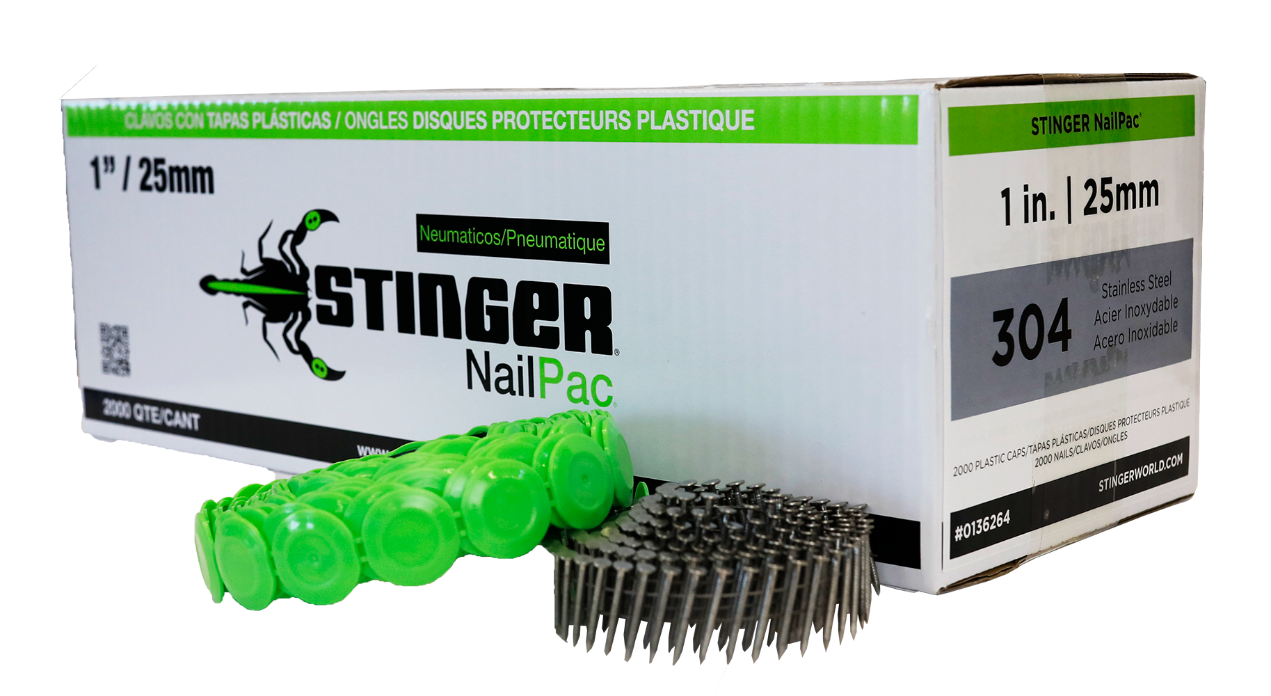STINGER NailPac is designed for exclusive use with the STINGER CN100B Cap Nailer. The CN100B is an innovative and versatile pneumatic tool that was engineered to make securing underlayment easy. Each 2000 count NailPac—which includes ten reels of 200 1" plastic collated caps and ten coils of 200 1" x .083 304 stainless steel ring shank nails—will cover approximately 25 square feet dependent on installation instructions and/or building code requirements. STINGER also offers the CS150B Cap Stapler and StaplePac® (1" plastic collated caps and ⅝", ⅞", 1-1/4", and 1-½" 18ga staples) for installing housewrap and foam board.