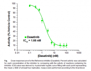Figure: Dose-response curve for the Reference inhibitor (Dasatinib). Percent activity was calculated for each concentration of the inhibitor by comparing with the activity of reactions containing No Inhibitor. IC50 value was derived by 4-parameter logistic curve fitting with each point representing the mean ± SEM of at least four replicates. Assays were performed according to the kit K2015 protocol.
