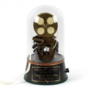 Rare, early 1900s Canadian National Telegraphs stock ticker, invented by John Burry, made by The Stock Quotation Telegraph Co., with correct base and glass dome (CA$11,800).