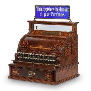 The American-made stock ticker, complete with correct base and glass dome, was patented in the 1890s and was the top lot of the auction, barely nosing out a National Cash Register Company (Dayton, Ohio) Model 3 cash register, also from the 1890s, which brought $11,500. The register had a rare, cobalt cut-to-clear glass-top sign, burled walnut sides and rear panels and the correct key. A label on the underside indicated it was shipped to a J. A. Banfield in Toronto, Ontario.