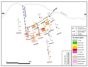 CC19-08 is located between the reported intercepts in CC19-06 and CC19-01 and completes a fence of three drill holes that step out to depth in this area. The most significant intercept of 22 metres from 340 metres comprises a true thickness of 15.8 metres averaging 3.61 g/t gold and 28.5 g/t silver. The upper gold zone in CC19-07 intercepted a 62-metre interval, with a true thickness of 30 metres grading 0.55 g/t gold and 3.9 g/t silver from 76 metres of depth.