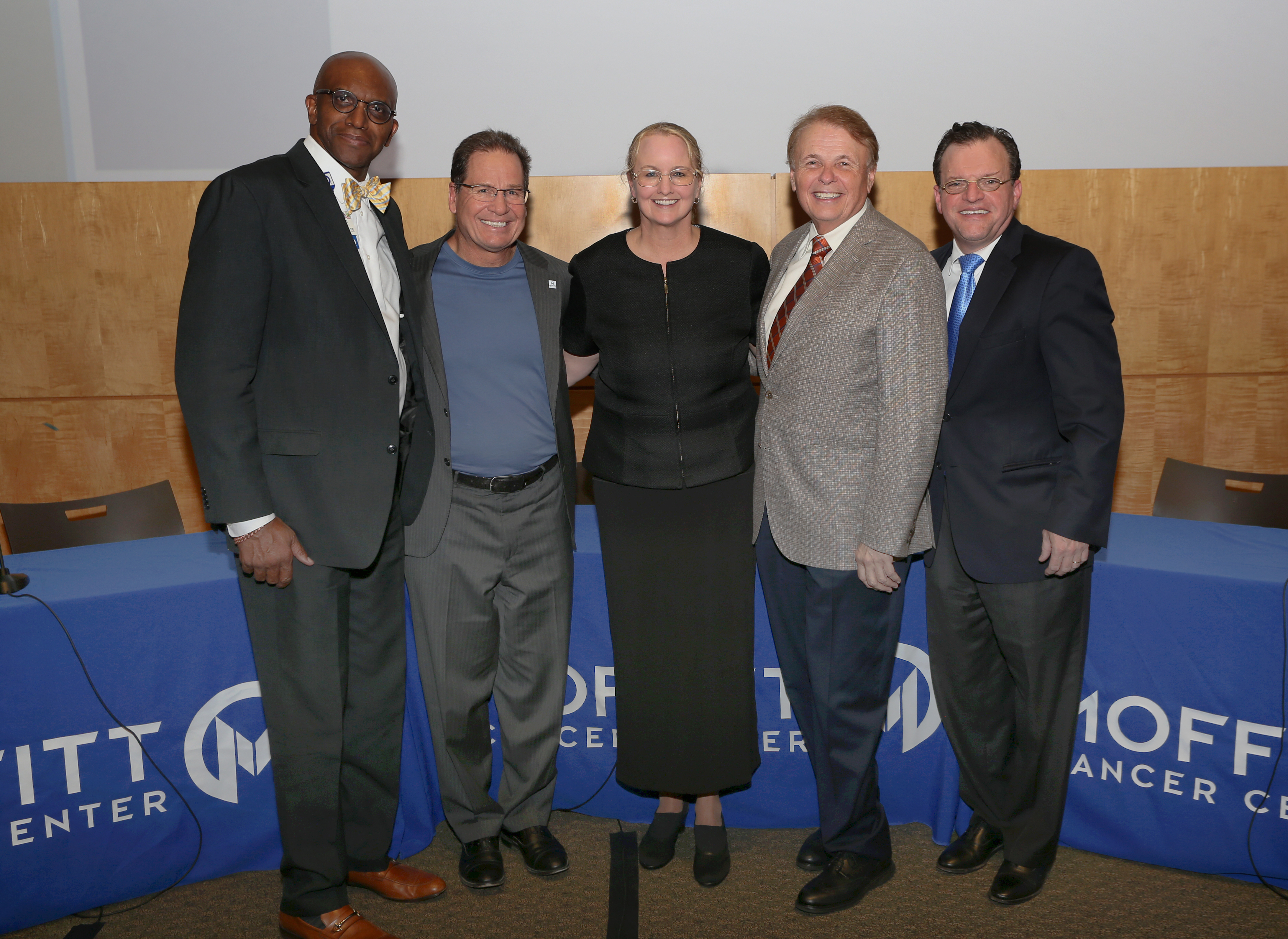 Photo Caption: From L-R: Dr. B. Lee Green, vice president, Moffitt Diversity, Public Relations & Strategic Communications; Dr. Douglas Letson, Moffitt physician-in-chief; Dr. Sarah Hoffe, section head, Moffitt GI Radiation Oncology; Dr. Larry R. Thompson, president, Ringling College of Art and Design; Dr. Jason Fleming, chair, Moffitt Gastrointestinal Oncology Program