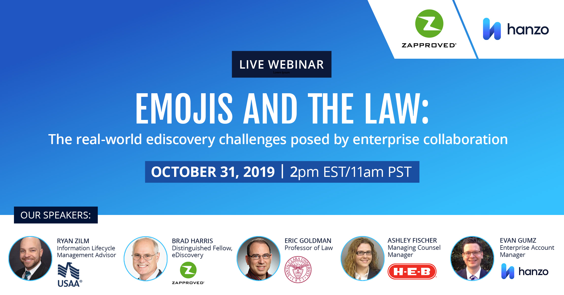New York, NY, Oct. 03, 2019 (GLOBE NEWSWIRE) -- Hanzo, a pioneer of contextual collection and dynamic web content software, and Zapproved, the leading ediscovery software provider for managing corporate litigation readiness, today announced a stellar lineup of industry experts for an upcoming live webinar, “Emojis and the Law: The Real-world eDiscovery Challenges Posed by Enterprise Collaboration,” held on October 31, 2019, at 2:00 pm ET. This special free web event will include a discussion surrounding modern enterprise collaboration platforms, the increasing trend in casual and emoji-filled communications, the challenges that these communications pose from a legal perspective, and how corporate legal teams can mitigate risk.
