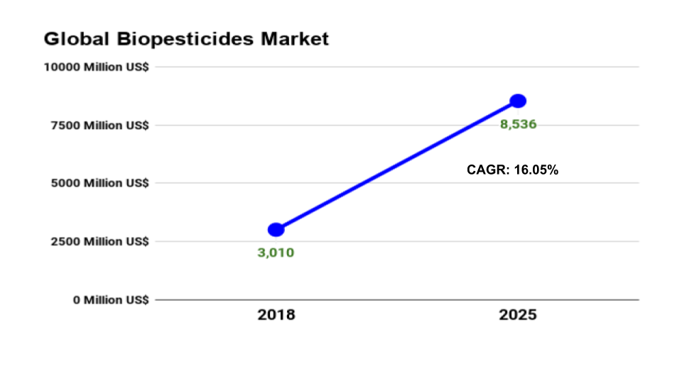 The Global Biopesticides Market is expected to grow from USD 3010.47 Millions in 2018 to USD 8536.56 Millions by the end of 2025 at a Compound Annual Growth Rate (CAGR) of 16.05%.