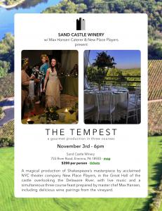 A Delicious Collaboration between Chef Max Hansen, Sand Castle Winery & New Place Players. The Tempest — a Gourmet Production in Three Courses