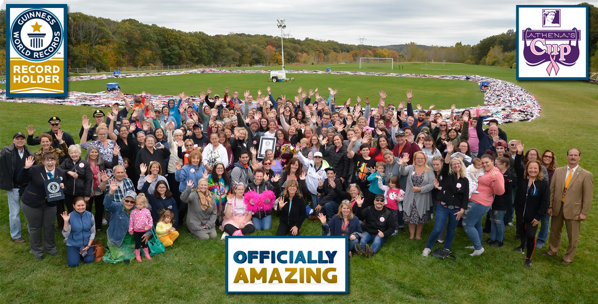 To interview Jennifer Jolicoeur about working towards and achieving this impressive world record contact Athena’s Home Novelties, 640 Winter Street, Woonsocket, RI, 02895. For more information, or to make an online donation to help with hooking expenses and help by donating to research visit www.athenascup.org. The Athena’s Cup is a registered 501 (c) (3) charitable organization. The Athena’s Cup has no paid employees. All public relations, marketing, bra collecting, counting, and hooking have been supported by the generous time donated by Athena’s corporate staff, salespeople and our family of volunteers.