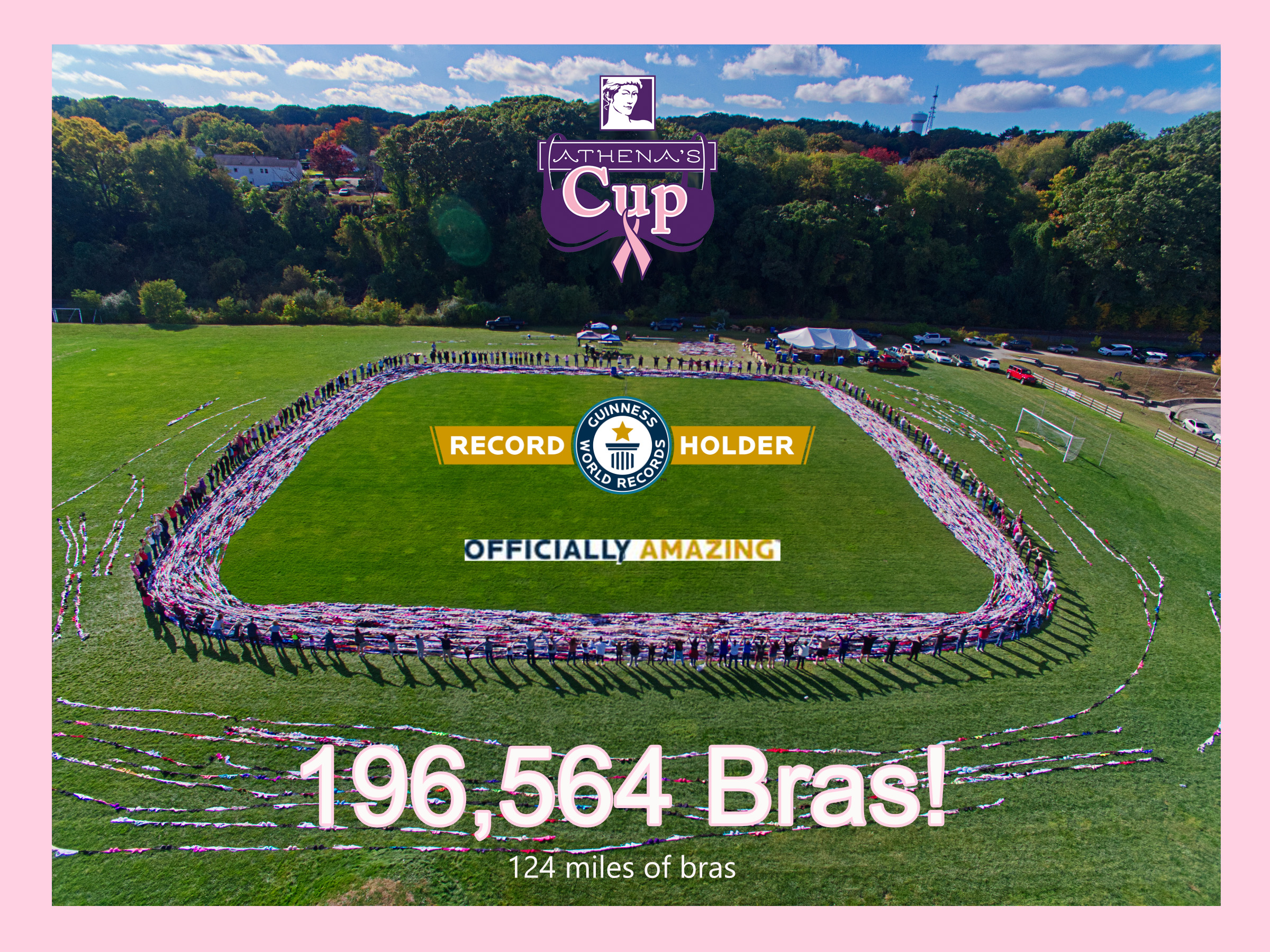 For 13 days, from early morning to late evening, The Athena's Cup collaborative, the mayor Lisa Baldelli-Hunt and the city of Woonsocket, Rhode Island, Firefighters, Police, Citizens, Friends and their children and our beloved Goddesses and Adoni, hooked, judged, logged, measured, walked and ran to make the world's longest bra-chain. This is what we can do when a community comes together. On October 16th Guinness World Records adjudicator, Christina Flounders-Conlon arrived at the beautiful outdoor sports complex in Woonsocket. She spent hours reviewing and validating video and the bras on the field to ensure The Athena’s Cup had satisfied all requirements and had indeed created an unbroken, verifiable chain. At 2:30 pm she announced that The Athena’s Cup had satisfied all requirements.