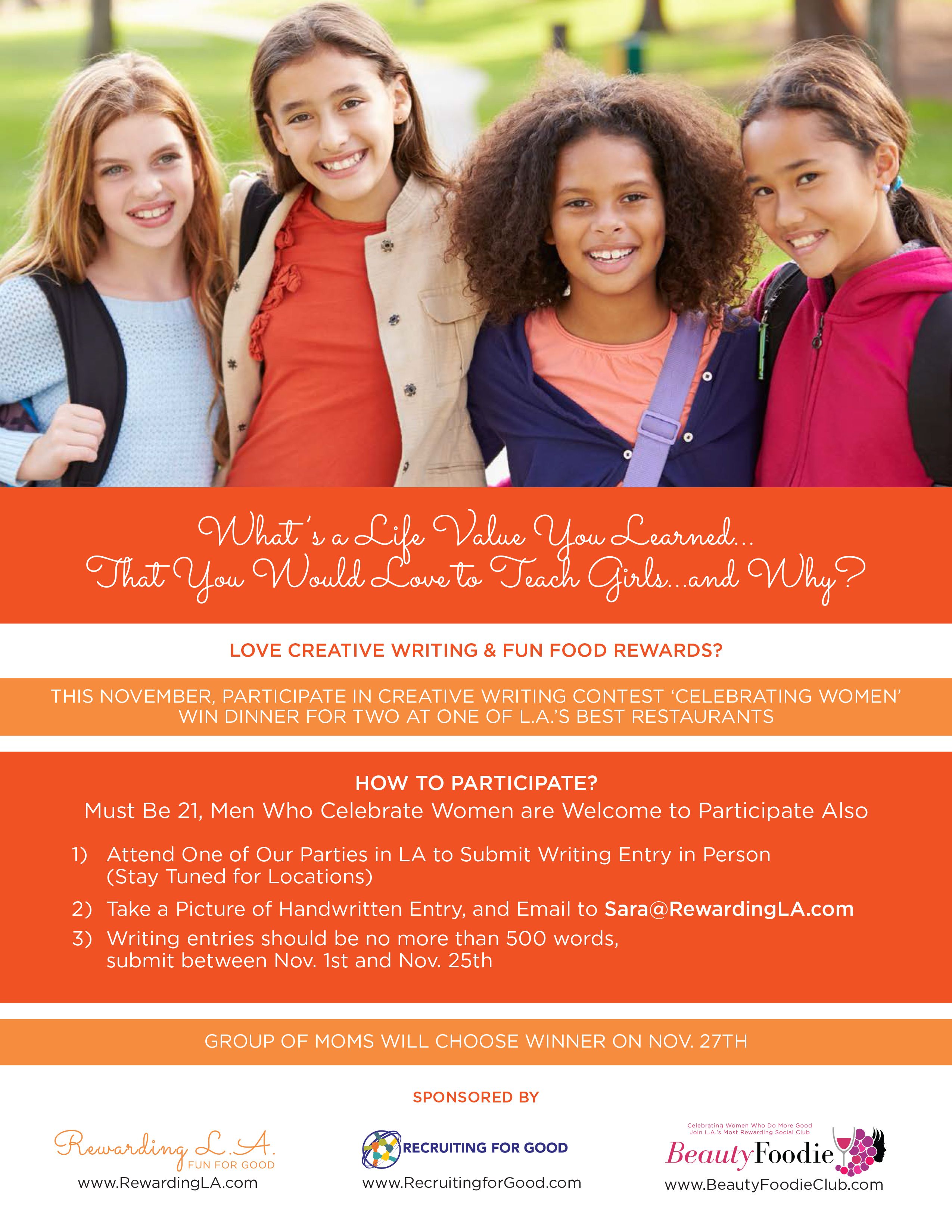 According to Recruiting for Good, and Rewarding LA Founder, Carlos Cymerman, "This November, participate by answering the following; 'What life value have you learned that you would love to teach girls? And tell us why?'"