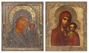 A collection of 19th century Russian icons includes the Virgin of Kazan (St. Petersburg), with a silver and enamel oklad and the maker’s mark of Ivan Khlebnikov.