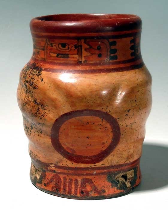 Mayan polychrome jar from the Ulua Valley of Honduras (circa 400-800 AD), 6 ¼ inches tall decorated with deeply carved step pyramids and glyphic symbols (est. $800-$1,200).