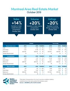 L’Île-des-Sœurs, Quebec, Nov. 06, 2019 (GLOBE NEWSWIRE) -- The Quebec Professional Association of Real Estate Brokers (QPAREB) has just released its most recent residential real estate market statistics for the Montreal Census Metropolitan Area (CMA), based on the real estate brokers’ Centris provincial database.