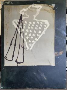 A mixed media painting by James Nares (N.Y./England, b. 1953), titled Aphoristic Two Tune (1984), signed and dated and titled on verso, is expected to reach $15,000-$25,000. The work appears to be a watercolor and oil on linen affixed to a large piece of galvanized steel. The overall size is impressive at 44 inches by 60 inches. The silk piece is 34 inches by 41 inches.