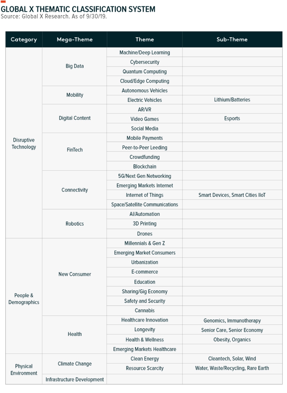 The thematic classification system is reviewed quarterly by the Global X Thematic Classification committee to consider new potential categories, mega-themes, themes, or sub-themes. Changes in the classification will be announced at the time of release of the following quarterly Thematic ETF Report.