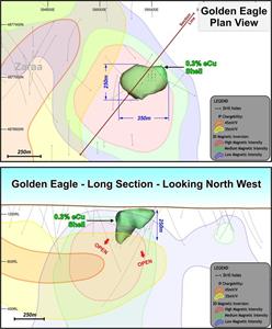 Plan and long section of Golden Eagle showing drilling, exploration target, inverted 3DIP and VRMI data and 0.3eCu boundary based off drilling.