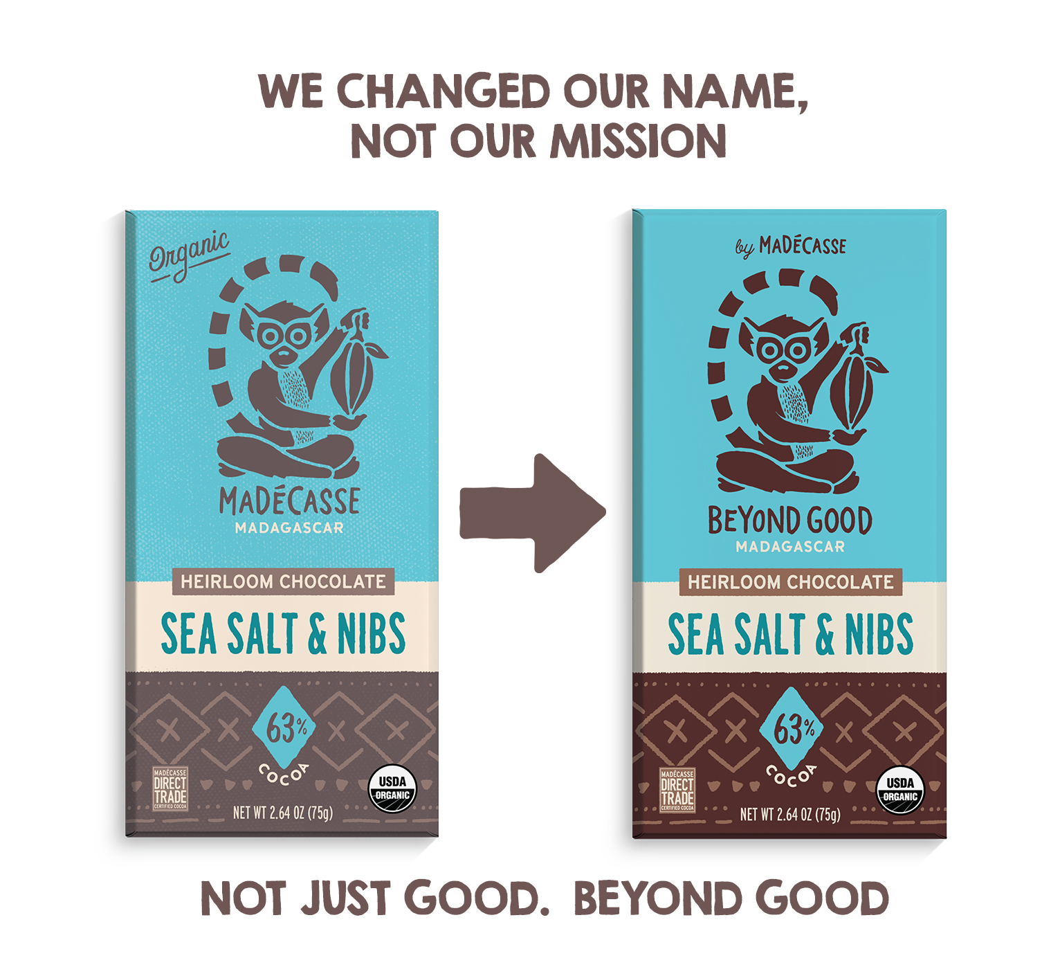 Beginning in January 2020, products bearing the new Beyond Good branding will begin to appear at retail as well as the company's advertising, website, and social channels. The packaging will remain largely the same for the short term and will include “By Madecasse” to maintain brand recognition. The company collaborated with branding agency River & Wolf to craft an expressive name that emphasizes the robust range of flavors, sustainability standards, and transparency practices. “Naming is never easy, especially re-brands, but it was a privilege to develop a name for this ethical and compassionate company,” expresses Margaret Wolfson, Founder and Creative Director of River & Wolf.