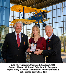 Steve Ziomek, Chairman and President of TB2, stated, “Megan is an outstanding example of what a student’s interest in aviation can accomplish. Along with her studies and keeping a 4.0 GPA, Megan also works as a Certified Flight Instructor teaching other new students how to fly while she builds her hours of flying time. We are extremely proud to present her with our first aviation scholarship and I, as a pilot myself, look forward to following her advancement within the aviation industry.”