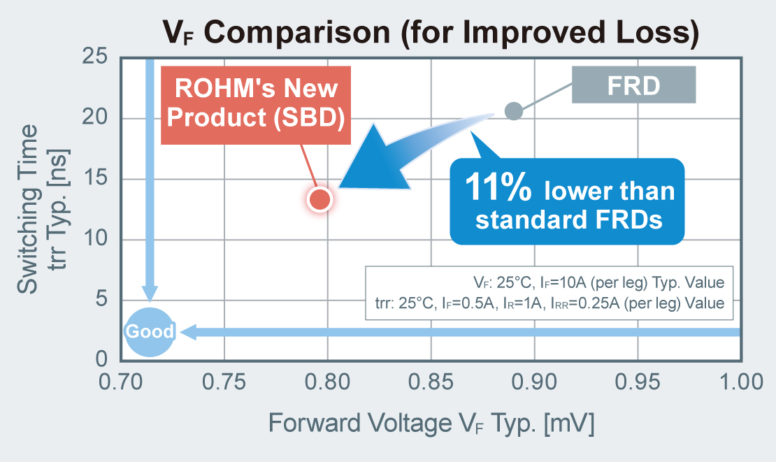 Ultra-low IR allows ROHM to achieve high withstand voltage of 200V. This enables replacing 200V FRDs used in automotive systems with high efficiency SBDs. Therefore, the RBxx8BM/NS200 series reduces VF characteristics by 11% over conventional FRDs, contributing to lower application power losses.