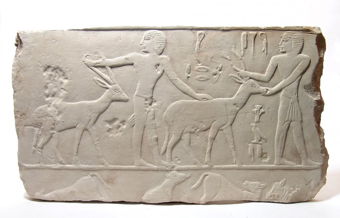 Wonderful Egyptian limestone relief dating to the Old Kingdom (circa 2200 BC), depicting a pair of kilted men leading antelope, beautifully carved, 18 ½ inches tall (est. $7,000-$12,000).