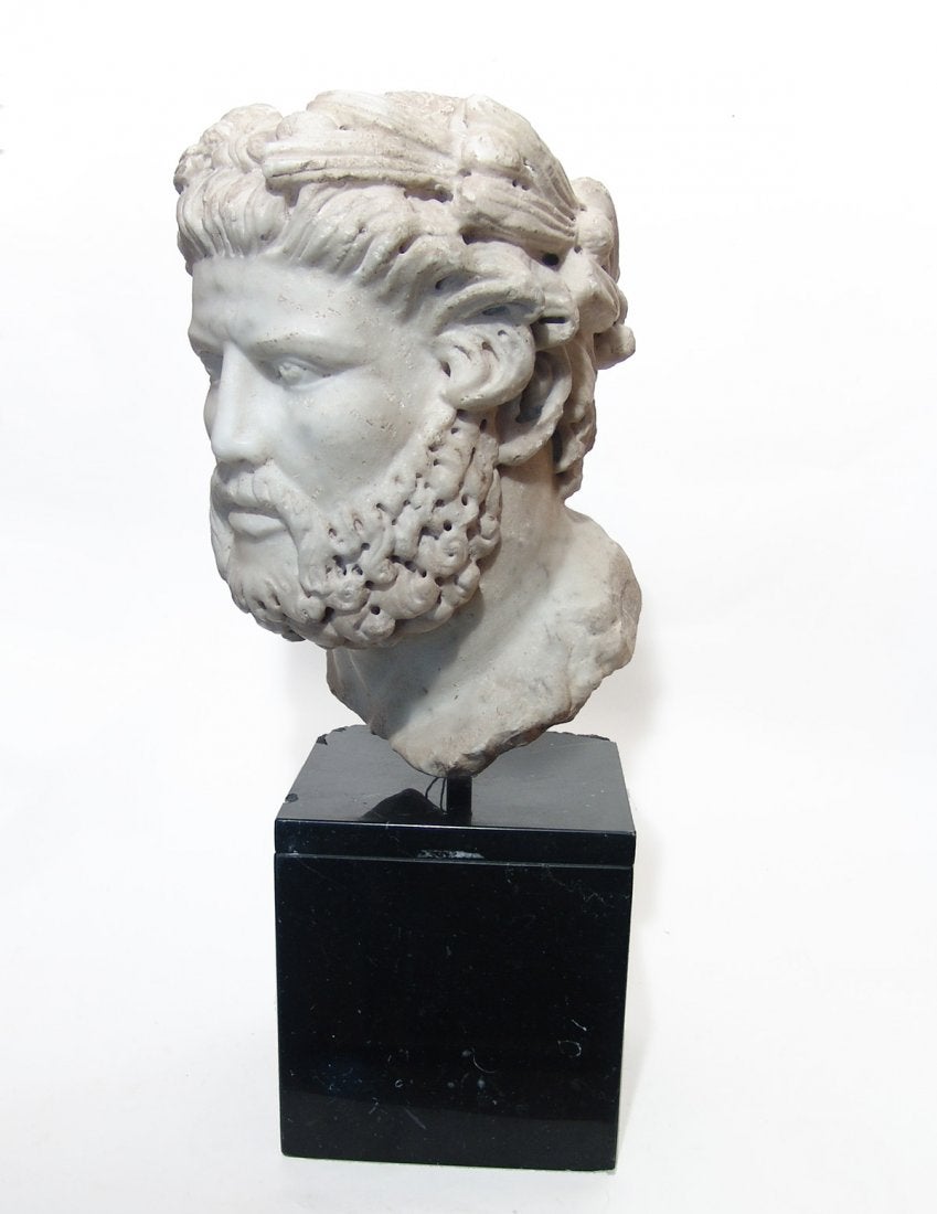 The life-size Roman marble head of an athletic victor is depicted wearing the pine crown of the Isthimian games. The features are skillfully carved, with wavy hair and a detailed curly beard. The head is perched on an old, heavy stone base, likely black marble. The overall height is just over 22 inches tall. The piece displays beautifully and carries an estimate of $30,000-$45,000.