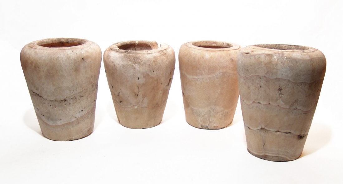 Set of four large Egyptian alabaster canopic jars (Late Period, circa 664-332 BC), each one carved from a creamy stone with horizontal veins, the tallest 8 inches (est. $12,000-$18,000).