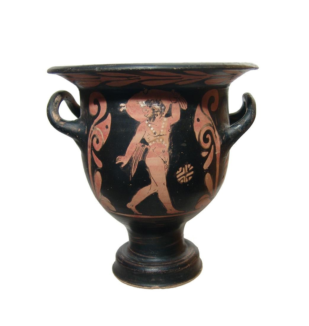 A gorgeous Apulian red-figure bell krater from the 4th Century BC, 6 ½ inches tall, one side featuring a striding nude satyr wearing a beaded harness and the other side a heavily robed female with diadem, has an estimate of $5,000-$7,000. Also, a lovely, circa 1st or 2nd Century AD bronze figure of a winged Eros, depicted nude and wearing a winged helmet, reaching back to draw an arrow from his quiver, should command $4,500-$5,500.