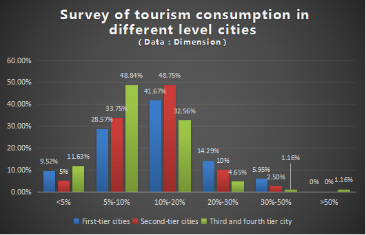 That is to say, the third-and fourth-tier cities resident population in the income less than the first-and second-tier cities, in tourism spending and investment is also relatively small. In first-tier cities, 20% of people are more likely to spend a fifth or more of their income looking for "poetry and distance" .